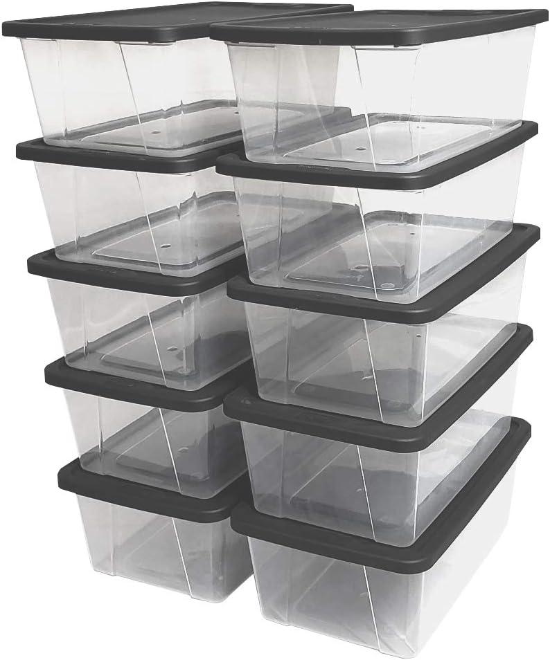 Stop sweating the small stuff, and organize it instead. Perfect for shoes, art supplies, gardening accessories, or any other tiny tools, this pack of 10 Homz Snaplock Extra Small 6-Quart Clear Storage Container will ensure your daily go-to's are easy to find and within reach. Pack up or organize a bathroom or closet with ease using this 10-pack of extra small storage containers. Each tote is crafted from clear plastic so your belongings will be easy to spot when you need them. A stylish and functional gray snaplock lid ensures your things will stay safe during a move or prolonged stay in storage. When you're finished using them, save space with the modular, stackable design of these totes. The pack of 10 bins nestle into each other for optimal space utilization.